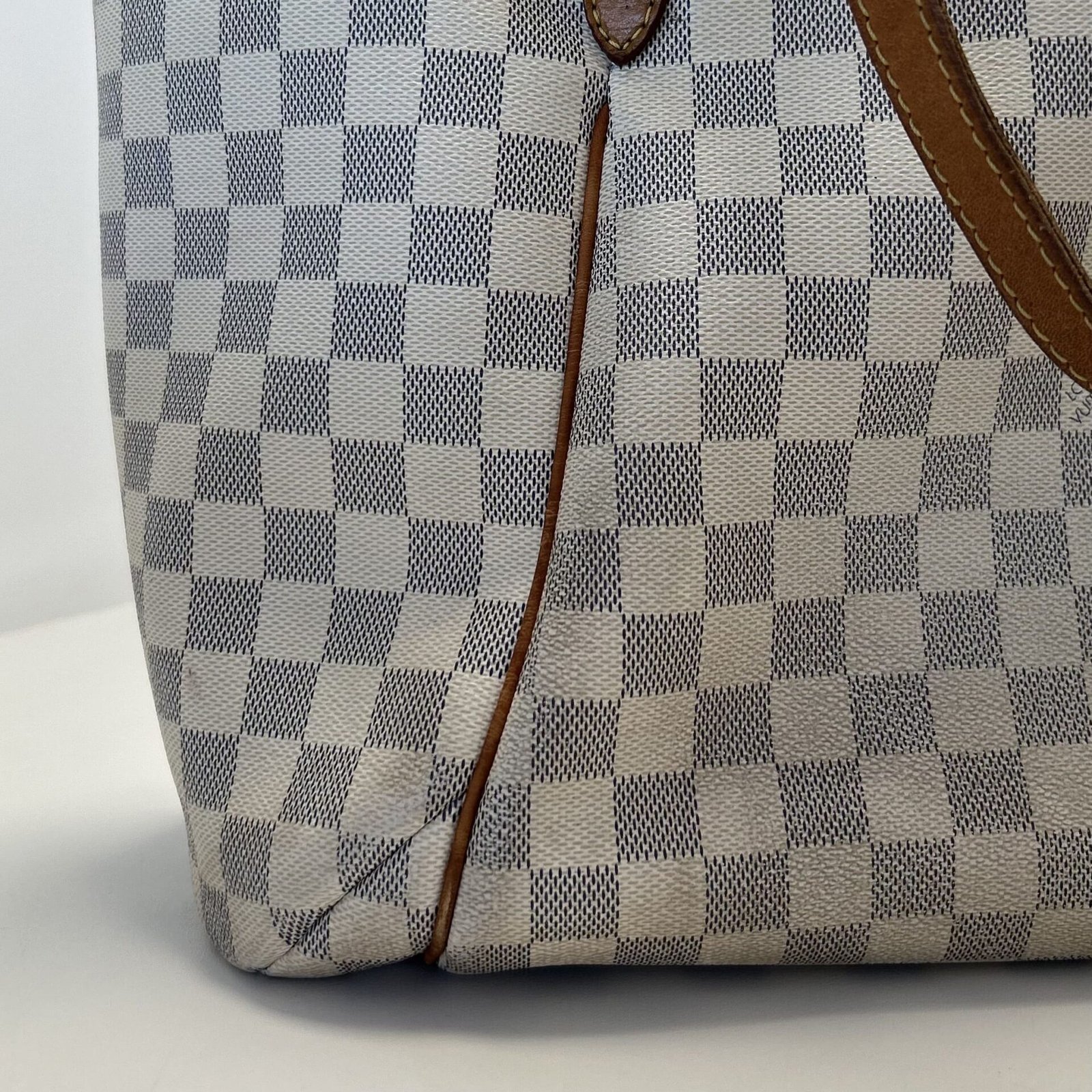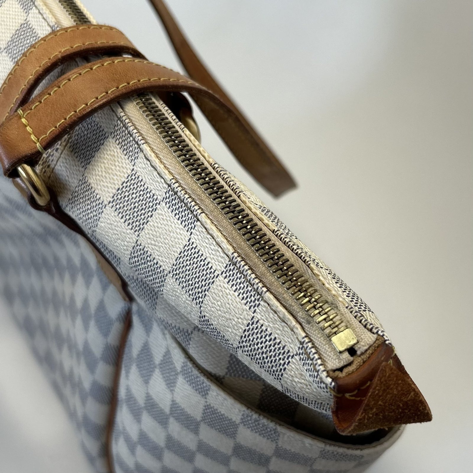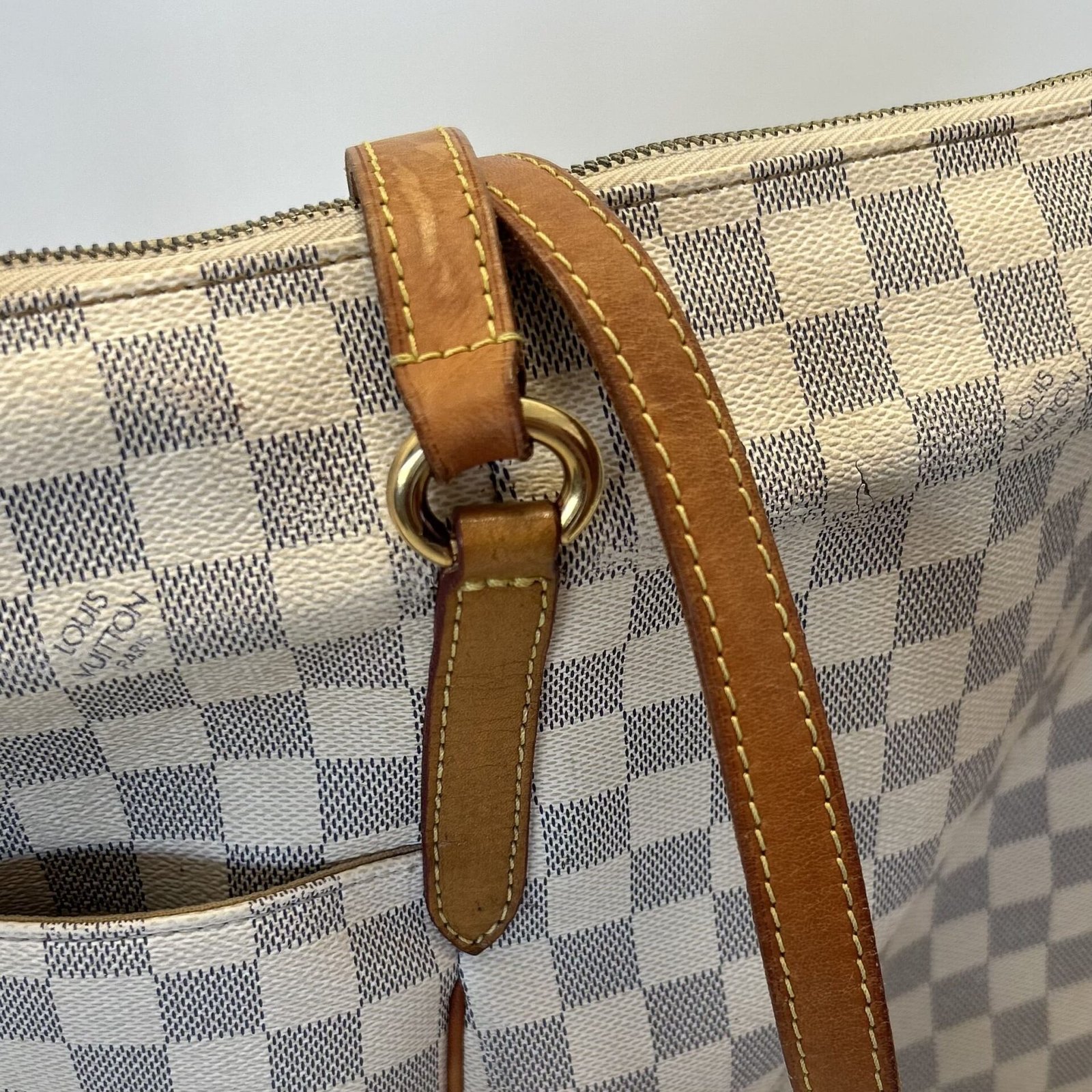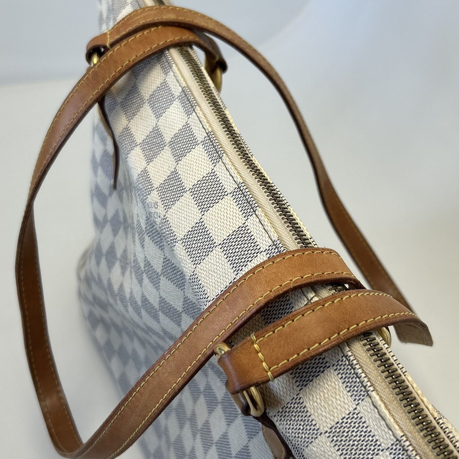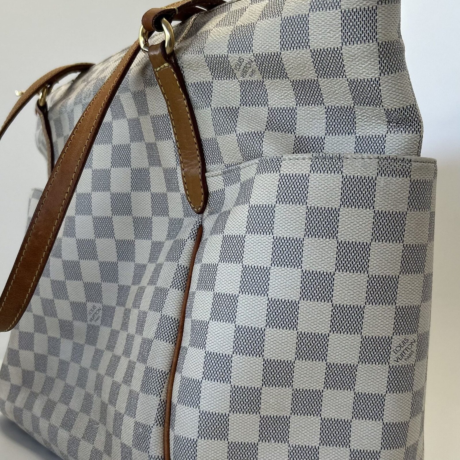 Bolsa Louis Vuitton Tottaly Damier Azur MG; Canvas Damier Azur e couro vachetta; Ferragens douradas; Alça dupla e curta de ombro; Compartimento único com quatro bolsos abertos, sendo dois internos e dois externos; Fechamento por cursor.